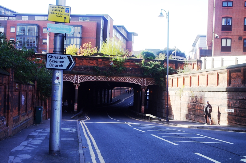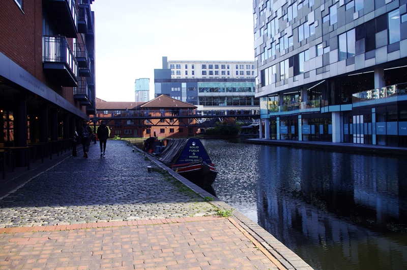 I started this walk by taking the train to Birmingham Moor Street. Across the road are steps leading to New Street and the shopping area. Just past New street Station I turned left down Stephenson Street, which has tram tracks now, then left down Navigation Street, under Suffolk Street Queensway and down Holliday Street. This goes under the canal. The next left gives access to the Waterfront Walk.