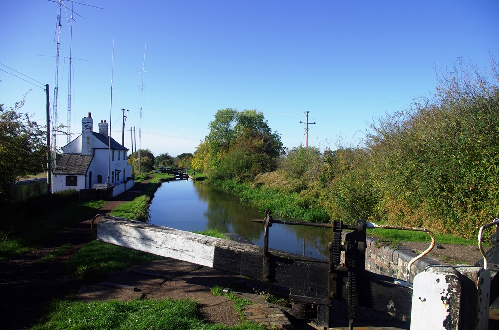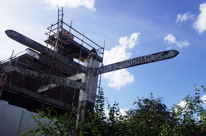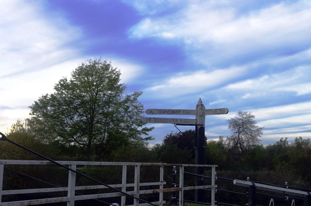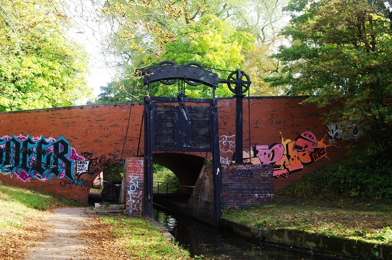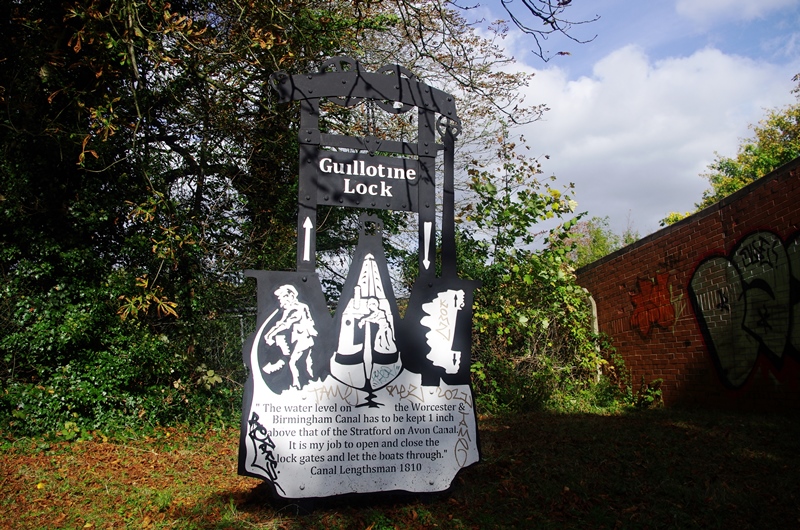 At Kings Norton is the junction with the Stratford on Avon Canal. Its first lock (now disused) is of an unusual guillotine type. The signpost at the junction gives the number of locks to the destination.
