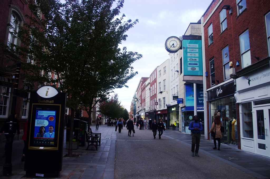 Two more locks follow (Blockhouse and Sidbury) with a view of the Cathedral. A large willow tree is followed by the building called the Commandery.